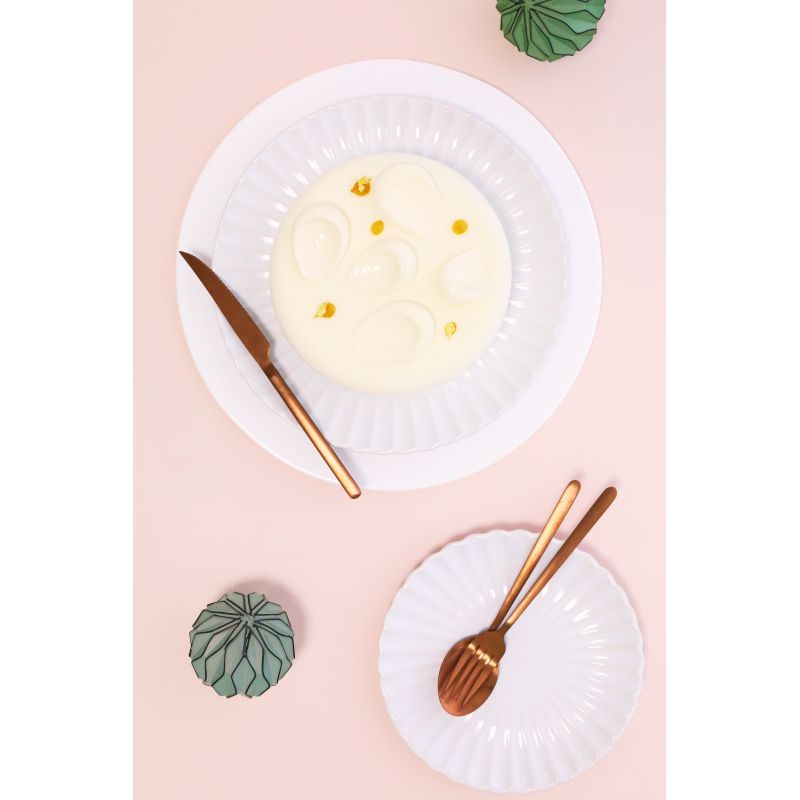 Croustillant recomposé noix de coco, dacquoise noix de coco, crémeux mandarine, marmelade mandarine, mousse noix de coco et crème allégée à la vanille.