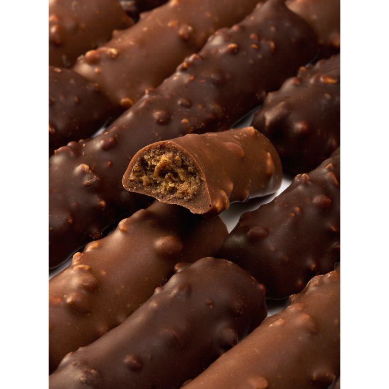 Un délicieux coeur de praliné feuilleté amandes et noisettes sous une couverture de chocolat noir ou au lait, piquée d’éclats d’amandes croquants.
