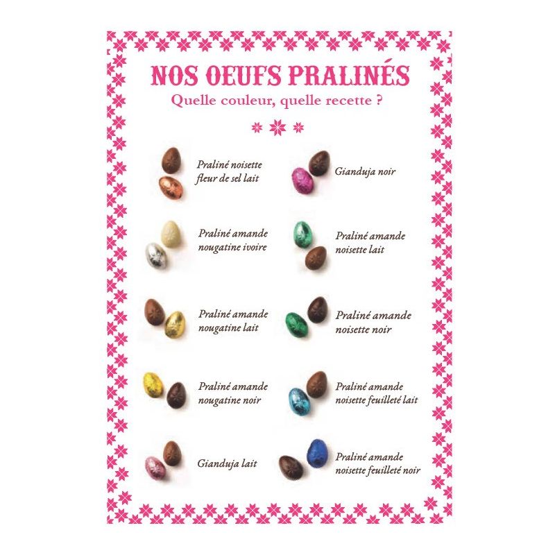 Œufs papillotés fourrés praliné chocolat noir, lait et blanc